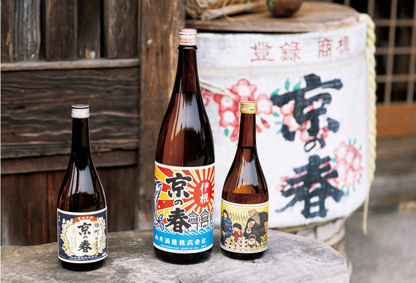 のど越しが良く、食中酒として料理に合うことが向井酒造の酒の共通點。右が「生酛仕込み 特別純米原酒 ひとやすみ」。中央が「京の春 大漁旗ラベル」、左は「京の春 雄町 純米原酒」