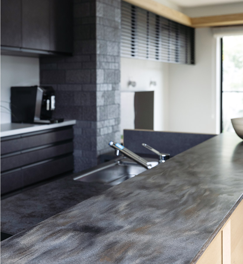 獨(dú)特の質(zhì)感がある人工大理石で、キッチンカウンターにもインパクトをもたせました