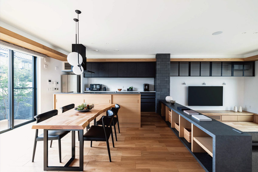 使い勝手へのこだわりはキッチンにも生かされました。背の高いキッチンカウンターで手元を隠して、ダイニング側(cè)からの見た目をすっきりと演出しています。ダイニングには一枚板のテーブルと、黒のチェアをコーディネート。自然の美しさが印象的なテーブルとは対照的に、完全な球形のペンダントライトが大小2つ並んでコントラストを描いています。