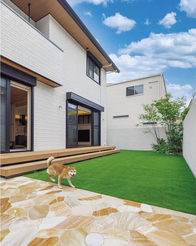 広々とした南側(cè)の庭は、プライベートなドッグラン。最小限の植栽で手入れの手間を抑えながら、景観にも配慮