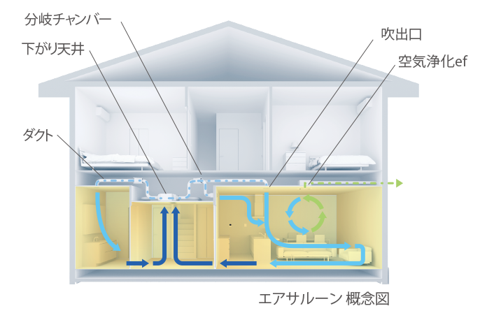 家族が集まる1階のリビングを中心に、心地良い空気を低コストで効率良く屆けるシステムです。「空気浄化ef」が空気の清浄と高換気を両立して快適な空気をキープ。洗面室や廊下などの非居室も快適です。