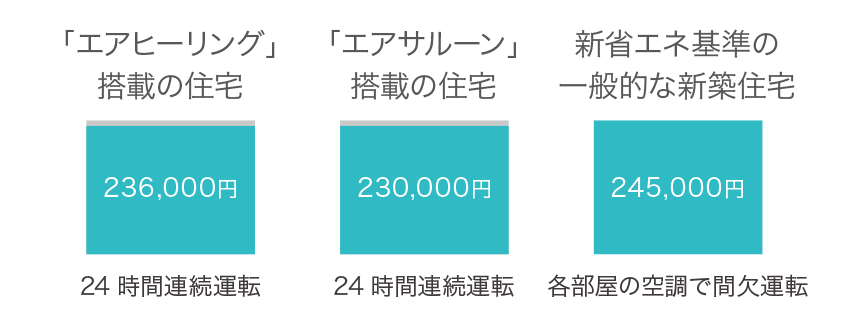 [計算都市]東京、[斷熱仕様]エアヒーリング搭載住宅?エアサルーン搭載住宅:xevoΣスタンダードV仕様、一般的な新築住宅:新省エネ基準相當、[オール電化]調理機器:IHヒーター、給湯機器:エコキュート