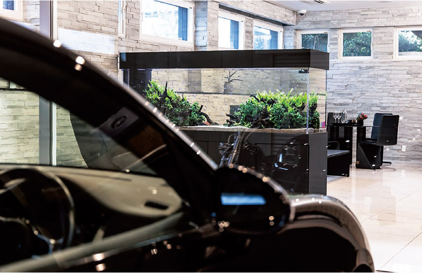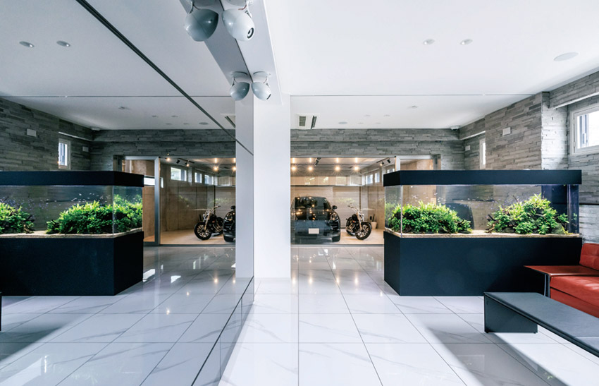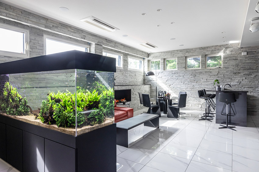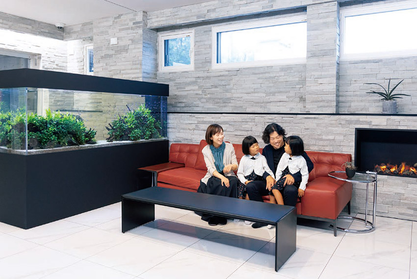 モノトーンを基調に赤いソファをポイントとして取り入れたスタイリッシュなインテリアの中で、ひときわ目を引くのは、水槽の中を優雅に泳ぐ熱帯魚の姿。ソファに腰掛けた時に眺めやすい場所や高さを計算して特別にあつらえたもの。室內壁には石の壁材がふんだんに張られ、自然光を受けて陰影のある表情を醸し出します。