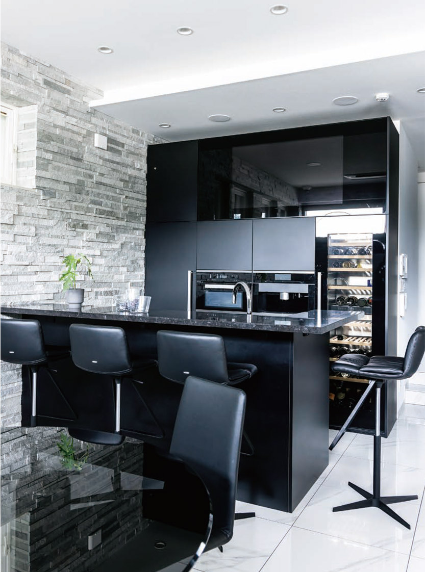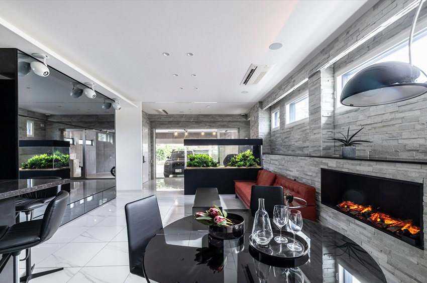 ガレージの反対側には黒で統一感を出したキッチンとダイニングがあります。冷蔵庫やワインセラー、電子レンジやエスプレッソマシンなどをすべてビルトインして、生活感をほとんど感じさせません。外からの騒音が気にならないよう防音性にも配慮されており、「ここでノートパソコンを開いて仕事に向き合うと、とても集中できます」とIさま。壁面の電気暖爐を眺めれば、ゆらめく炎が疲れた心を癒やしてくれます。
