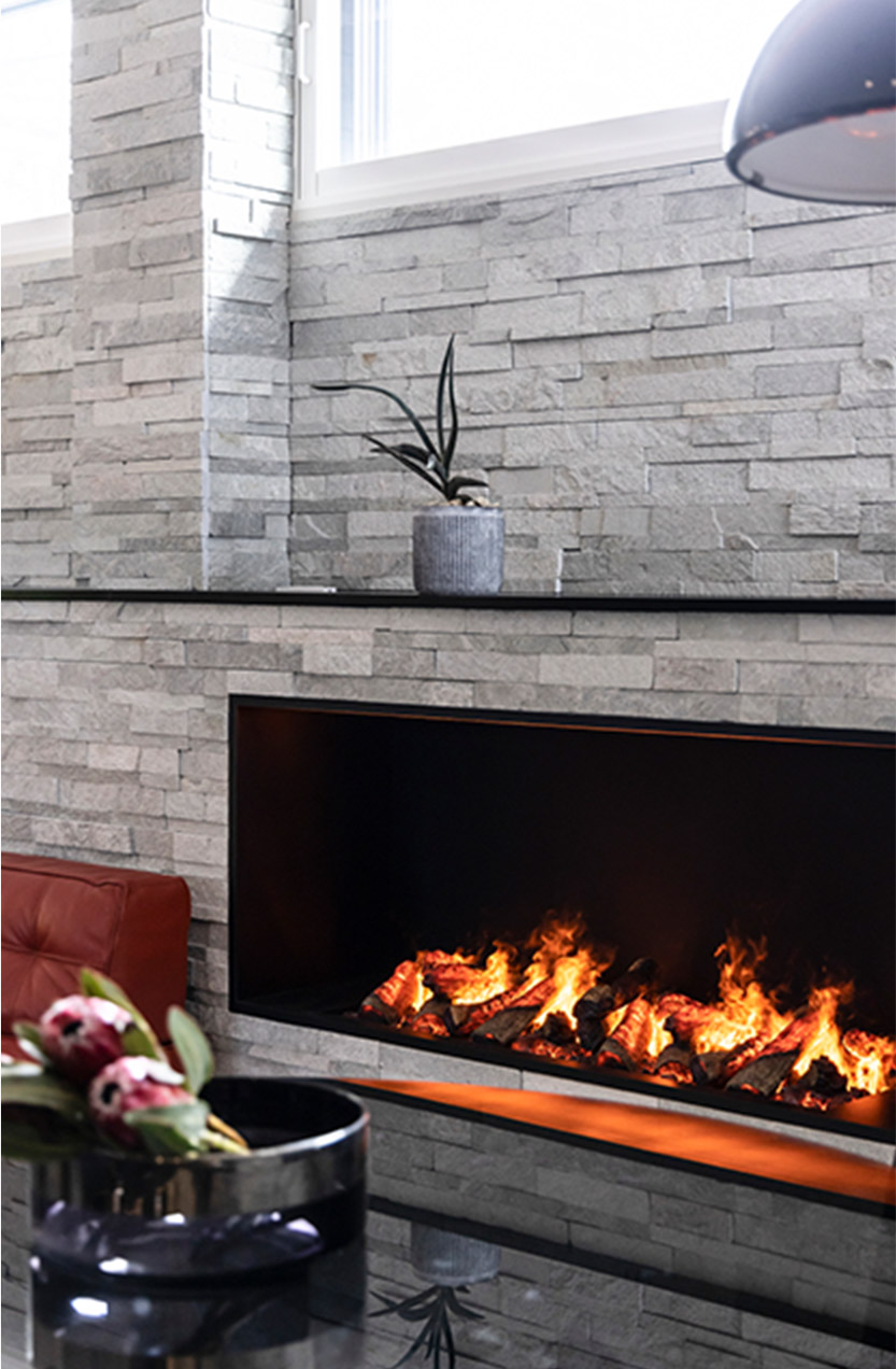 電気暖爐は熱くならないので、冬場以外も活用可能。壁は腰高より下を少し手前に出して、さりげなく小物を置けるスペースを設けました