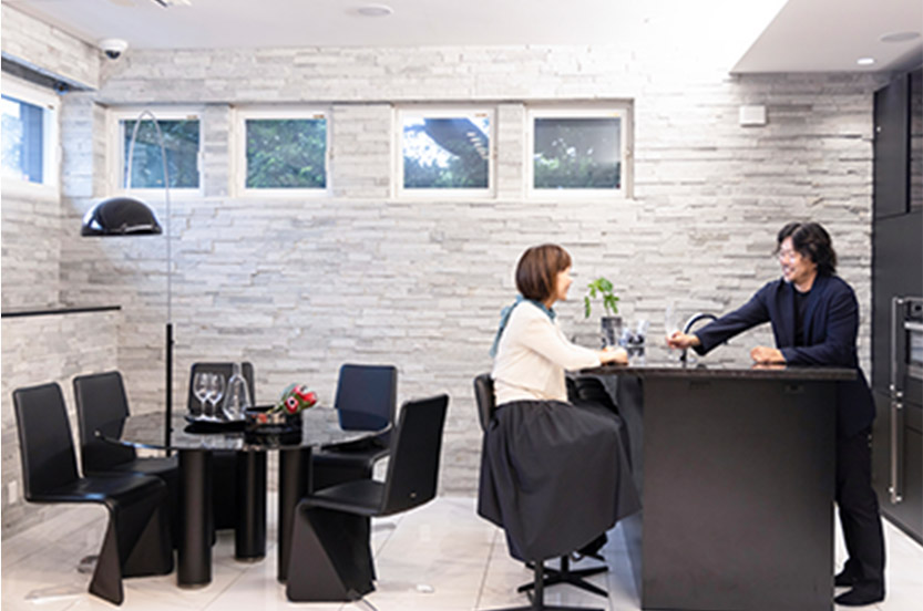 我が家の「バーカウンター」を挾んで、二人だけの時間を過ごすIさまご夫妻。イタリア製の円形ガラステーブルとアーティスティックなチェア、美しいカーブを描くフロアランプなど、一つひとつの家具や照明にもこだわりが光ります