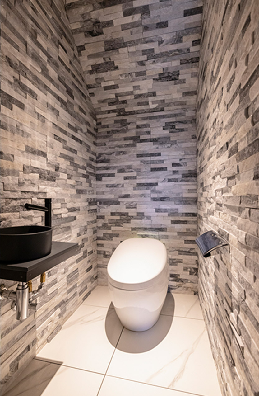 石の壁材を張りめぐらせた1階のトイレ。まるで洞窟のような雰囲気で、心が落ち著くのだそう