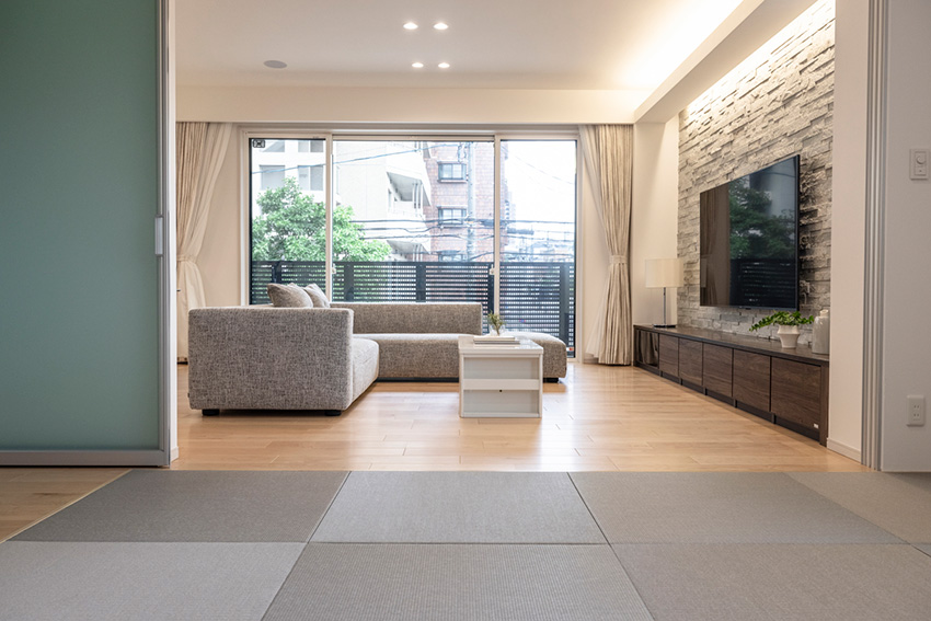 リビングに隣接する7.8帖の琉球畳の和室は、子どもたちの遊び場など多目的に使われています