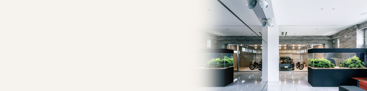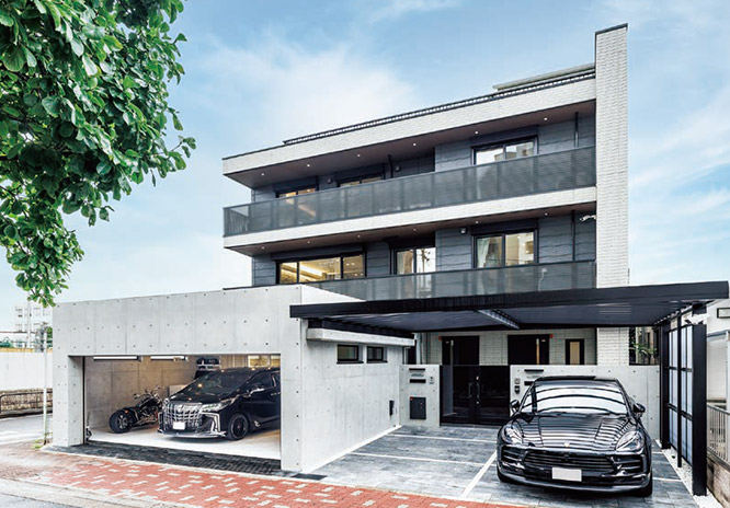 Iさま邸は仕事と生活の場を兼ねた3階建てのお住まいです。家族のプライベートスペースは2?3階に設け、1階は「事務所」として“憧れの空間”を追求。部屋全體をロースタイルとし、約3mの天井高を確保しています。併設したRC構造のガレージはガラスを隔てて室內空間と一體に見えるよう設計されており、愛車やバイクの並ぶ様子をいつでも眺めることができます。