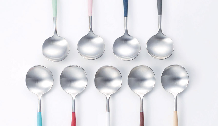 ジュゼ氏はまず、月の光をイメージしたスプーンが特徴的なオールステンレスのMOONシリーズをデザインしました。優雅でエレガントなフォルムが際立つモデルです。次に、樹脂とステンレスを組み合わせたGOAシリーズのデザインに著手しました。柄の部分を樹脂とするアイデアは、軽量化してより使い勝手を高めることが目的です。天然樹脂の選定や、接合部分をシームレスにするための研磨技術の確立には長い時間を要しました。こうして數年の開発期間を経て2004年に誕生したGOAシリーズは、他のカトラリーブランドが決して真似ることのできない稀有(けう)な存在となりました。今日ではテーブルを演出するさまざまなカラーが用意されています。
