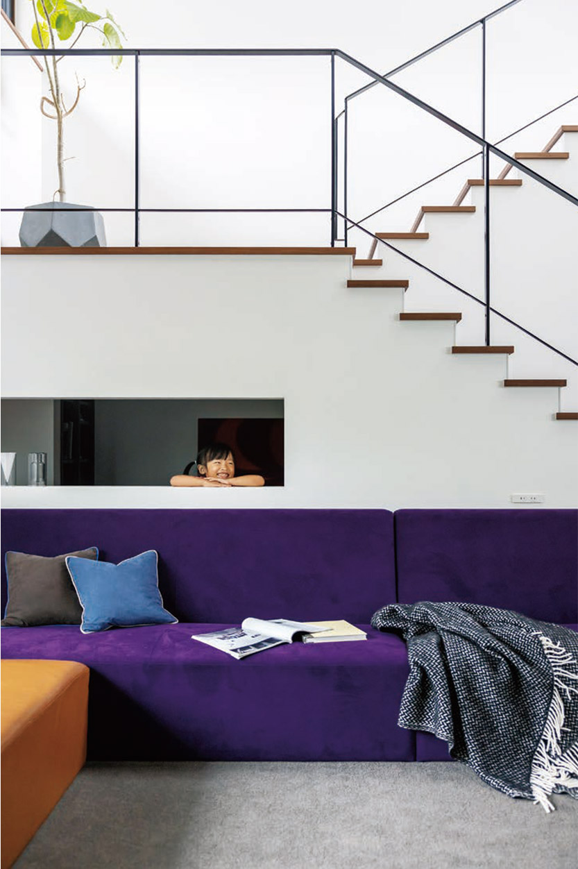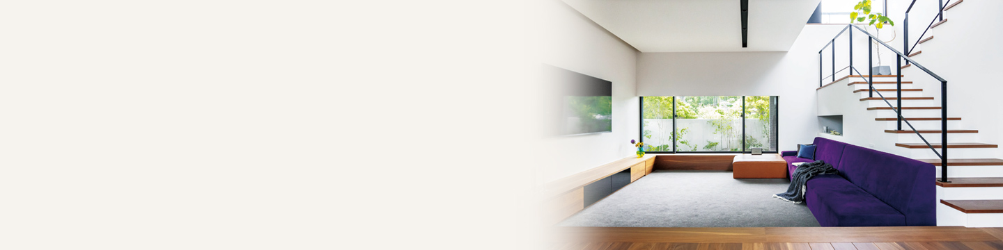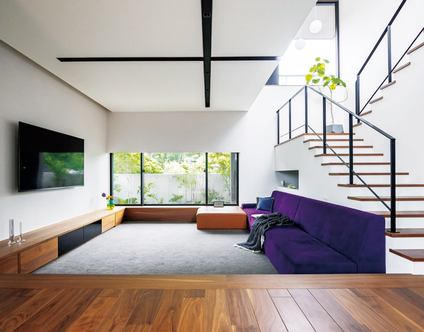 暮らしのメインステージとなるリビングはカーペット敷きのロースタイルで、自由にくつろげる広場のような場所。ワイドな開口部や階段吹き抜けから自然の光が屆きます。特徴的なのは、ダウンライトを埋め込んだ下がり天井の十文字。木質(zhì)の天井材も検討されましたが、Hさま邸にしかない個性的なデザインをと、設(shè)計士が提案。リビング階段のアイアン手すりの黒ともリンクして、空間を引き締めます。紫のカバーリングが目を引くソファは、リビングのサイズに合わせてオーダーしたもの。色數(shù)を抑えた空間の中で個性的なポイントになりました。