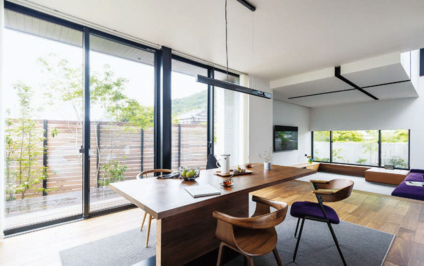「天井までのグランフルサッシをつけたり、希望する場所に窓を設(shè)けたりできたのは、強(qiáng)い構(gòu)造體のおかげですね」とKさん。細(xì)かな希望を一つひとつ葉えて完成したわが家で、心満たす生活が始まっています。