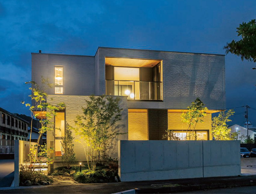 バルコニーや窓のデザインによって箱を重ねたようなシルエットに。フラット屋根の外観は、晝も夜も個性的な表情を生んでいます