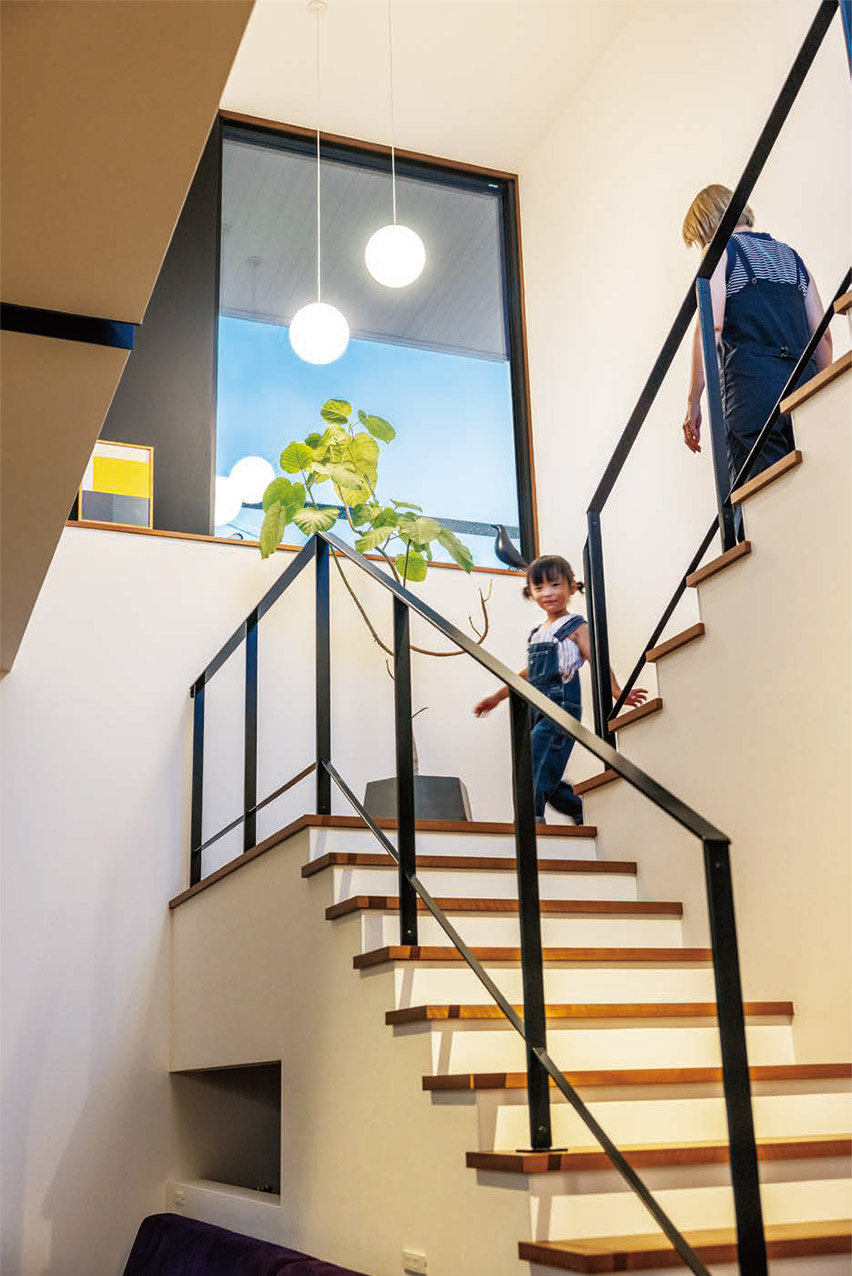 階段を上り下りする時に見える窓外の風(fēng)景が、日々の彩りに。夜になると二つのペンダントライトが窓に映り込み、ユニークな表情を見せてくれます