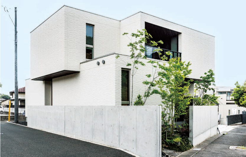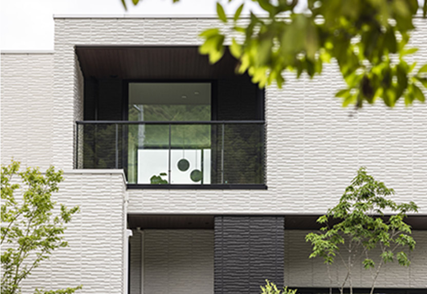 箱を重ねたような外観がHさま邸の特徴の一つ。バルコニーが凹みのように表現(xiàn)され、手前と奧の窓が重なって向こう側(cè)の空まで見通せるユニークなデザインになっています。外壁には彫りの深いサイディング外壁「ベルサイクス」を採用。2色の張り分けにより、ボリューム感や凹凸感のある外観を演出しました。