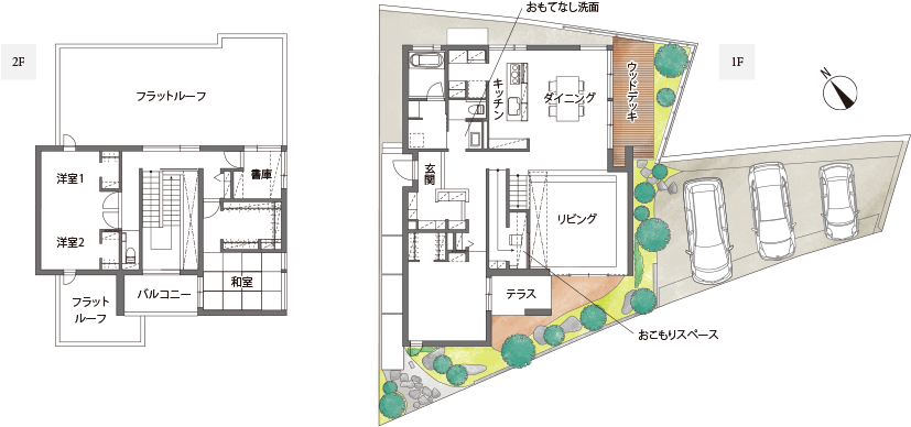 窓の位置や大きさ、季節(jié)ごとの光や風(fēng)の取り入れ方にこだわったのは夫のKさんです。設(shè)計士はさらに景色の切り取り方を綿密に検証しながら、外側(cè)から見てもバランスの良い開口部をデザインしていきました。L字型の敷地を生かして3臺の駐車スペースを取り、Tさんが望まれた豊かな庭をバランスよく配置。ダイニングからはウッドデッキを通って庭に出入りでき、ウッドフェンスで敷地外からの視線をカットしながら日常的に「外」を楽しめるよう工夫されています。