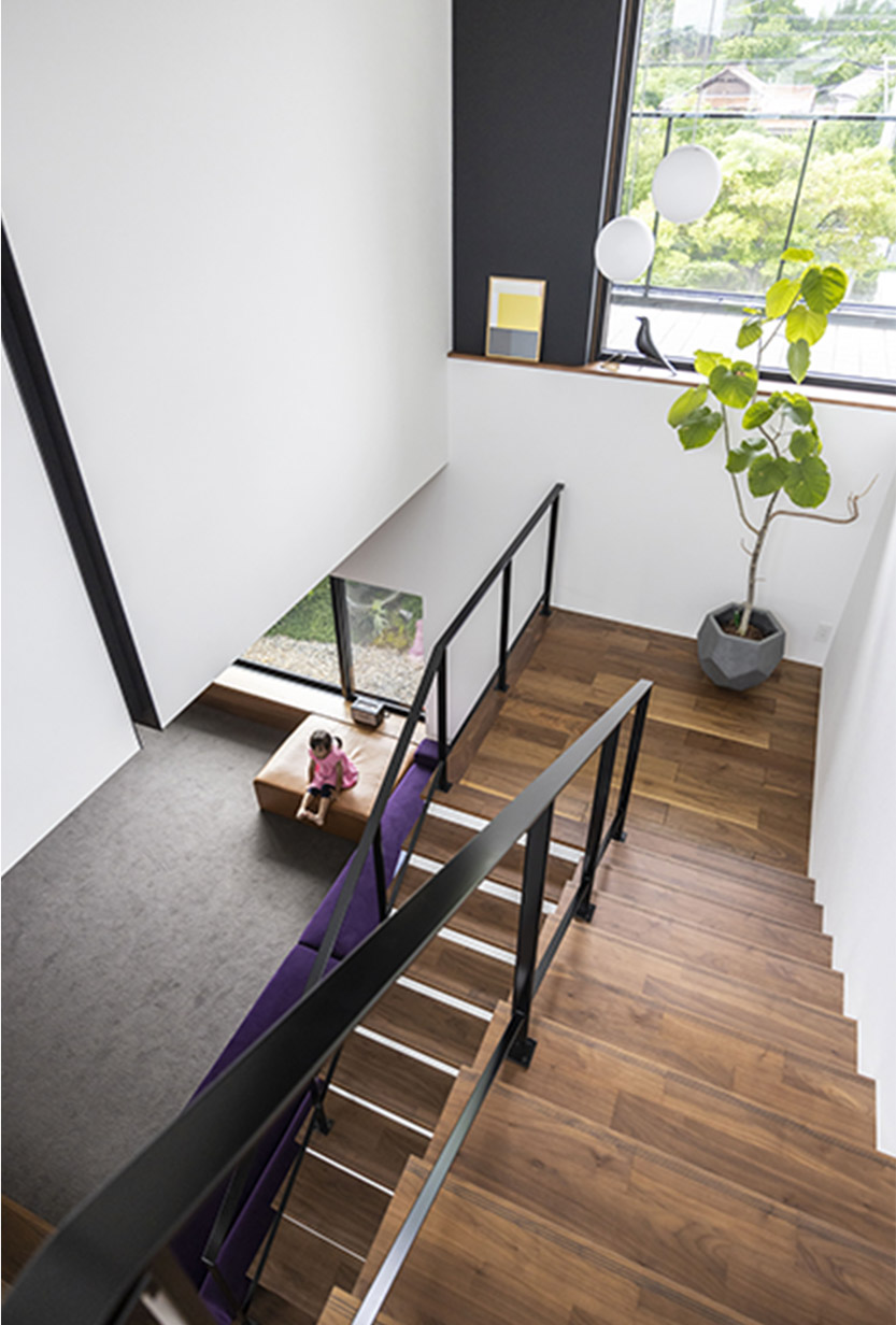 大きなFIX窓により、1階と2階を行き來するわずかな時間にも豊かな緑が目に入ります。1階のリビングは吹き抜け越しにたっぷりと光が屆き、自然な明るさに。踴り場自體も心地良い居場所の一つになります。