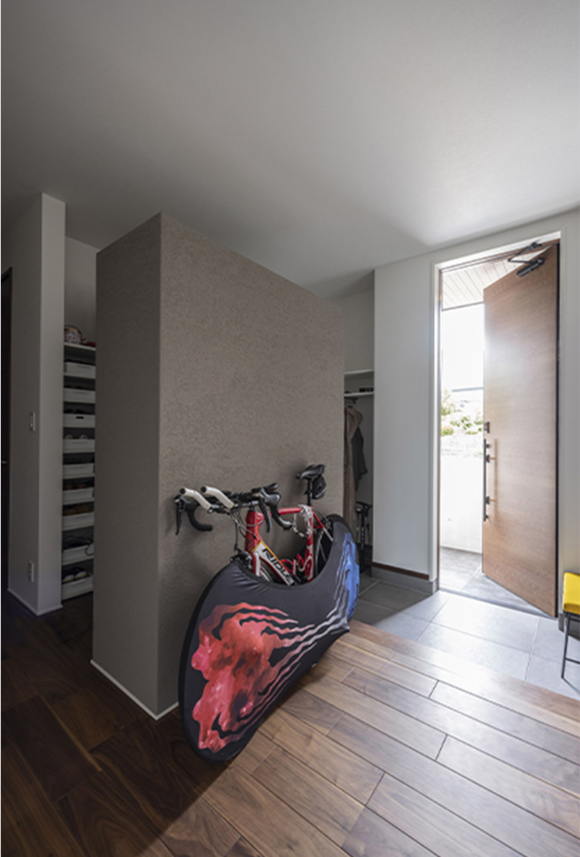 アプローチから玄関土間、玄関収納までタイルの床が続きます。玄関収納(寫真內(nèi)中央)は棚上部を天井と少し離して、圧迫感を感じさせないように配慮した設(shè)計。素材感豊かな塗り壁仕上げで、玄関ホールを彩ります。