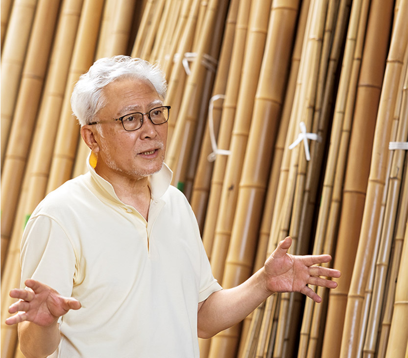建築の洋風化により建材としての竹の使用が減少する中、創業100年の歴史を守り続ける竹六商店(以下、竹六)。數少ない國內の竹建材メーカーとして、著名な建築家や海外からも注文を受けています。商業施設や店舗、住宅など、建築家やインテリアデザイナー、施主が求める空間のイメージに合わせて多種多様な竹素材を加工して提供するため、倉庫にある竹のストックは10萬本にも及ぶそう。竹を使ってもらう機會を一回たりとも無駄にしたくないという思いがその數に表れています?!盖螭幛椁欷郡长趣摔媳丐簭辘à郡?。そして、竹という文化を未來へつないでいくことが私たちの使命です」と代表取締役?田井中さんは話します。