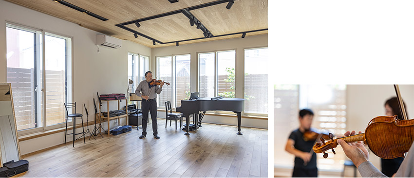 玄関を入って左の防音ドアを開けると、柱のない約42畳の大空間が現(xiàn)れます。大和ハウス工業(yè)総合技術(shù)研究所の防音室専門スタッフも設(shè)計(jì)に関わり、性能や広さを検討。床の高さを下げることで約3mの天井高を確保し、背の高い夫の泰嗣(やすし)さんがバイオリンの弓を振り上げても天井に當(dāng)たらないよう配慮しました。プロならではの大きな演奏音が気持ちよく響く空間に、ご夫妻とも、とても満足していらっしゃいます。