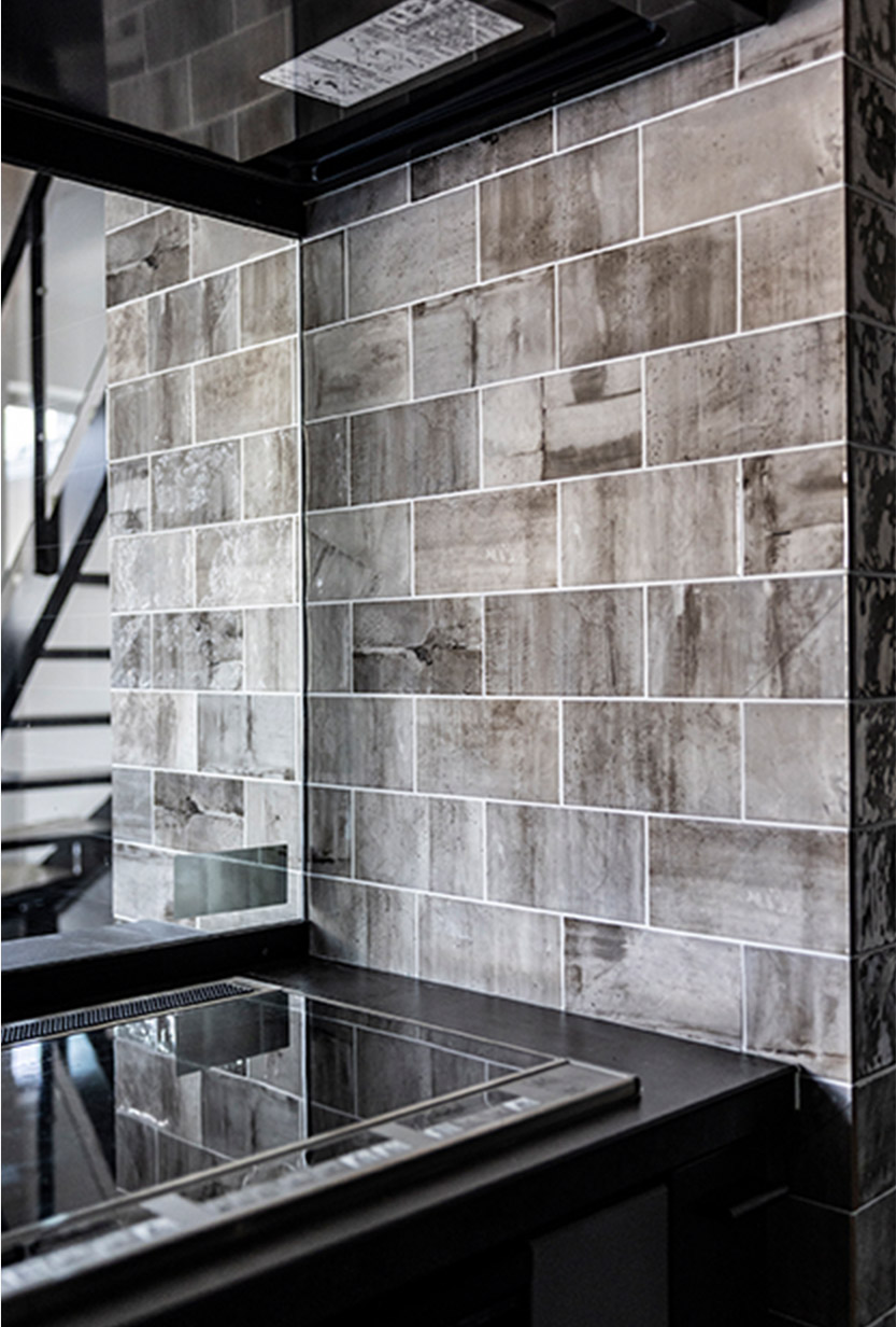 袖壁や背面に艶感のあるグレーのタイルを張ってアクセントに。ダークなカラーで統(tǒng)一感したキッチンに、華やかさを添えています。