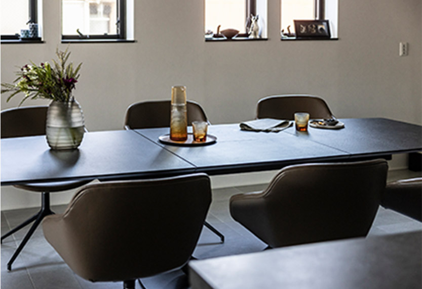 高級(jí)感漂うダークグレーのキッチン。ダイニングテーブルとチェアも同系色でコーディネート