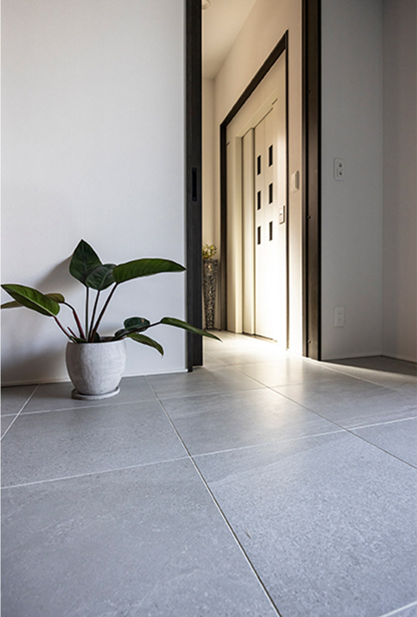 日常生活の中心になるのは2階なので、1?2?3階の移動(dòng)を楽にするため、ホームエレベーターを設(shè)置。年齢を重ねても安心して暮らせるお住まいです。2階のフロアはタイルで、1階(フローリング)と変化をつけています。