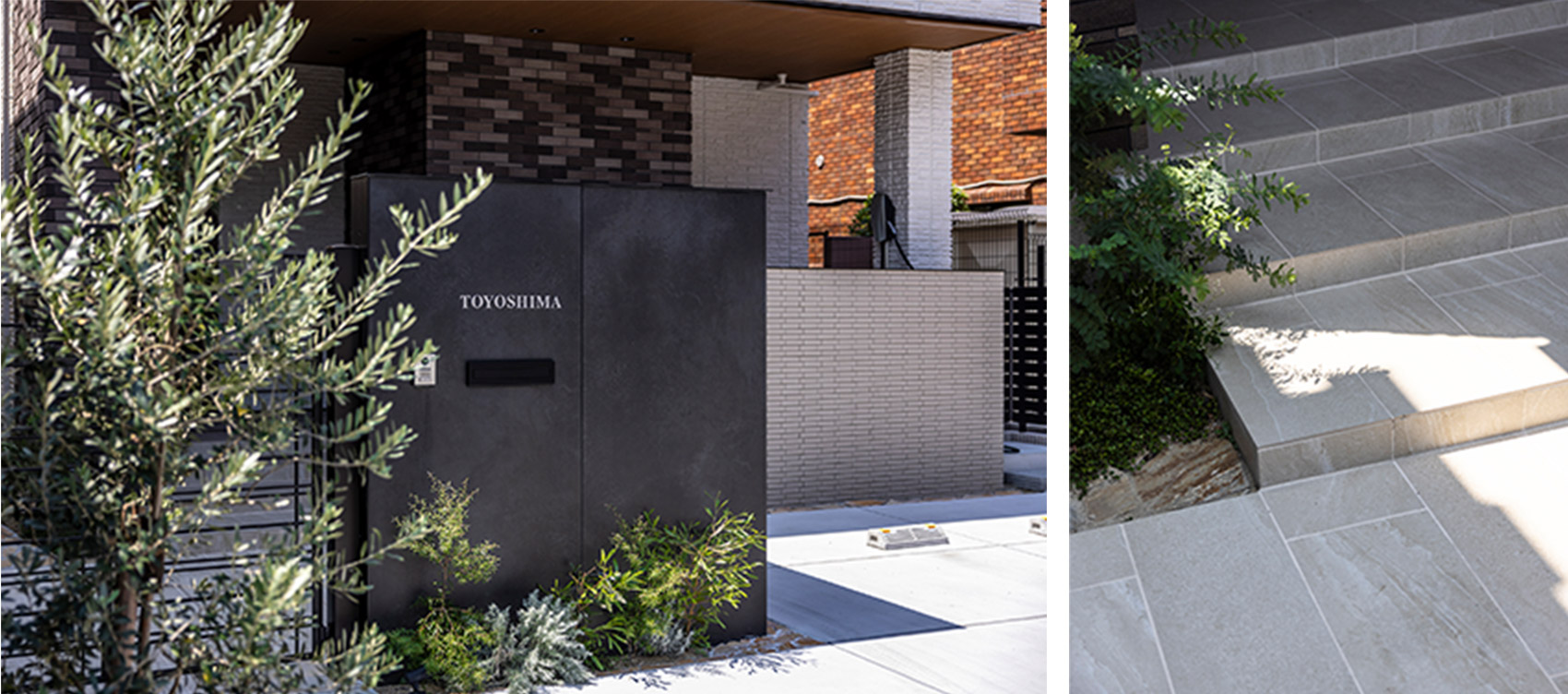 艶のある黒の門塀と直線を生かした門扉のデザインが、スタイリッシュな印象を與えます