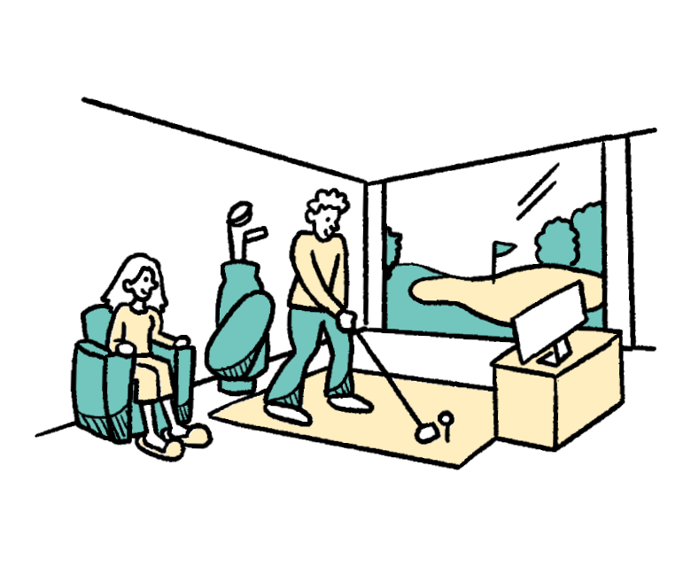 ゴルフシミュレーターを導入し、室內でゴルフのスイング練習はいかがでしょうか。スクリーンは映畫鑑賞、ゲームなど多用途に使えます。