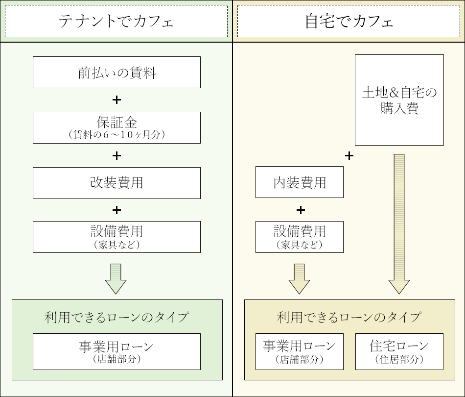 - 開業資金については、「テナントでカフェ」は事業用ローンのみであるの対し、「自宅でカフェ」は、事業用ローンと住宅ローンを併用することができる