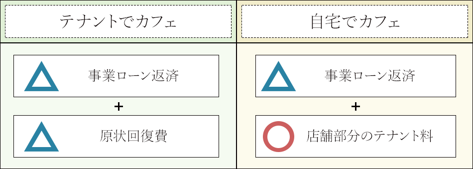 - 廃業した場合、「テナントでカフェ」は原狀回復費がかかるのに対し、「自宅でカフェ」は店舗部分をテナント物件として貸し出すことができるため、資産としての運用ができる