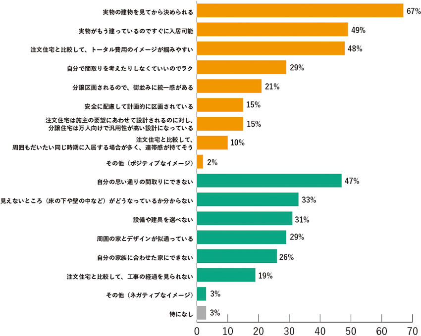 「分譲住宅」に抱くイメージとして、ポジティブなもの?ネガティブなものをそれぞれ聞いてみました。ポジティブなイメージの最多は「実物の建物を見(jiàn)てから決められる」(67%)で、次に多かったのが「実物がもう建っているのですぐに入居可能」(49%)、「注文住宅と比較してトータル費(fèi)用のイメージが摑みやすい」(48%)と続きました。
