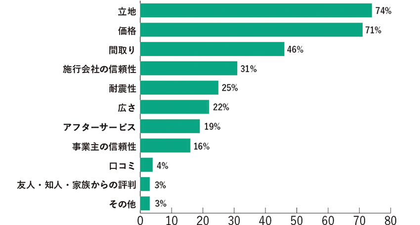 「立地」(74%)、「価格」(71%)の回答が多くを占め、次に「間取り」(46%)、「施工會(huì)社の信頼性」(31%)と続きました。回答を選んだ理由を深掘りしていきましょう。