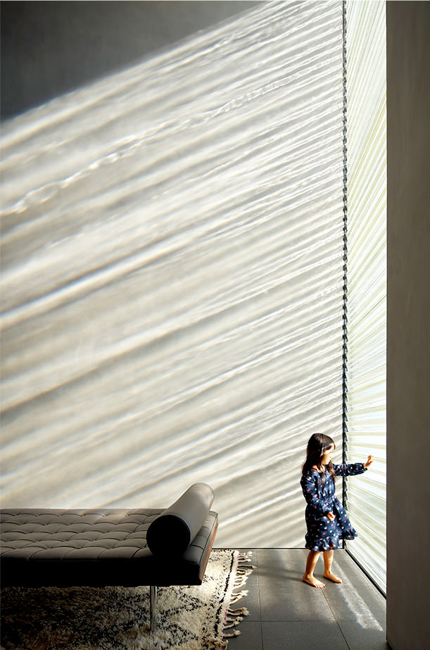 - 中村:南側に開きたいけどプライバシー的に開けない狀況でした。そこで採光を確保しながら遮音効果を高めるために光學ガラスの棒材を吹き抜けいっぱいに積み重ねて光を取り込む設計を提案しました。ガラス棒の斷面のカットの効果で、時間帯や季節によって日時計のようにさまざまな光のうつろいが現れる仕掛けです。虹が生まれることを想定し、実験で実証しながら設計を進めていきました。