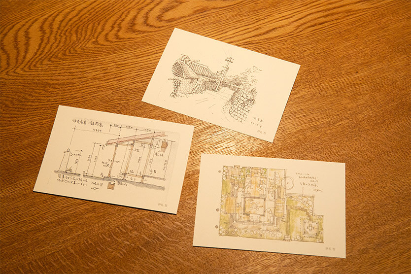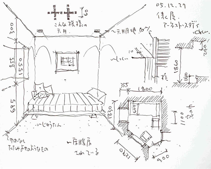 - 伊禮:「実測」も吉村先生と奧村先生の教えです。旅に出るときはスケッチブックとメジャーを持參し、いいなと思う建築のディテールを描いて寸法を測ります。いわば設計のメモ帳ですね。「そうか、天井高が2,100mmと低めだからプロポーションがいいんだな」などと確認するわけです。