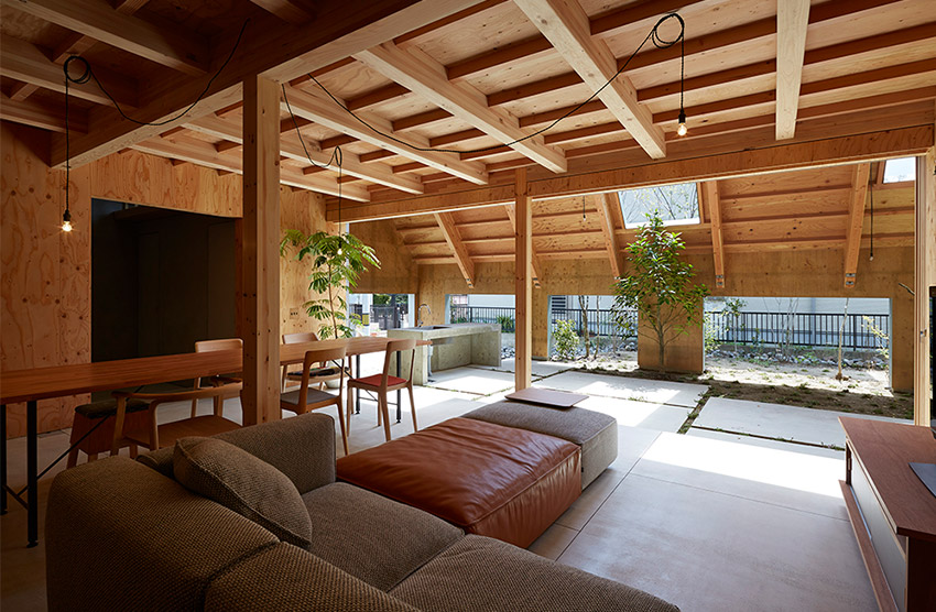 - 谷尻:お施主さまからは「子どもを外で自由に遊ばせたい」というご要望がありました。従來型の庭だと遊ぶとき以外は「ただ愛でるだけの庭」になってしまうと思い、庭も家の一部として使い、敷地全體を住宅として機能させることを考えました。敷地いっぱいに大きな屋根をかけて「外部のLDK」と「內(nèi)部のLDK」を作ることで、外で遊ぶのはもちろん、外でご飯を食べたり、外で音楽を聞いてくつろいだりと、部屋のように過ごせる庭になりました。そもそも「家の中だけが家」とは限りませんよね。