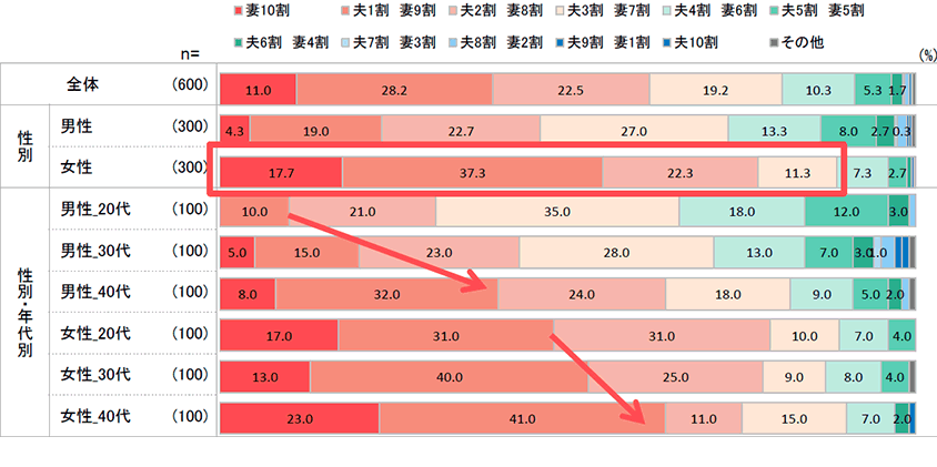 また、年代別にみると、夫の年代が上がるにつれて妻の負擔率が高くなっており、特に40代男性では「夫1割 妻9割」(32.0%)が最も多く、妻に家事のほとんどを依存している傾向がみられました。