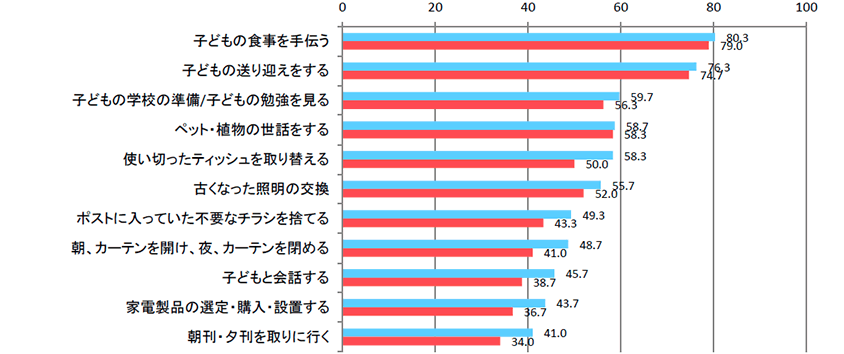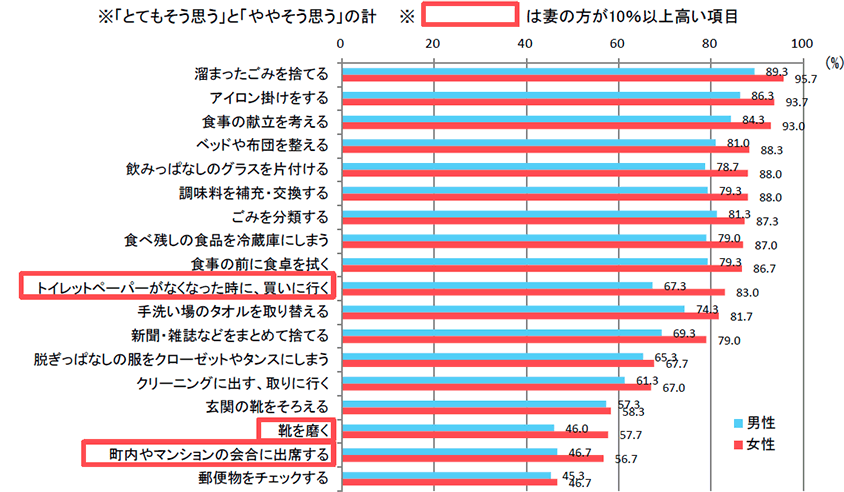 妻が日常的に頑張っているにもかかわらず、夫が家事だと認識していない「名もなき家事」の存在が明らかになりました。特に「トイレットペーパーがなくなった時に、買いに行く」(夫67.3%、妻83.0%)、 「靴を磨く」(夫46.0%、妻57.7%) 、「町內やマンションの會合に出席する」(夫46.7%、妻56.7%)が「名もなき家事」となっています。夫の方が多い項目は11項目。それらにおいても妻との差はわずかとなっていました。