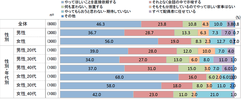 「配偶者に希望の家事をしてもらうためにどのような努力をしているか」を聞いたところ、全體の半數(shù)近い46.3%が「やってほしいことを直接依頼する」と回答。夫婦別では、妻は半數(shù)以上の56.0%が「やってほしいことを直接依頼する」と回答しているのに対し、夫は36.7%で、逆に「それとなく會(huì)話の中で示唆する」は妻の19.0%に対し、夫が28.7%と多くなっています。夫は遠(yuǎn)まわしに依頼する傾向がみられ、「何も言わない、放置する」という夫も13.3%おり、夫側(cè)から直接頼みにくい雰囲気を感じている人がいるようです。