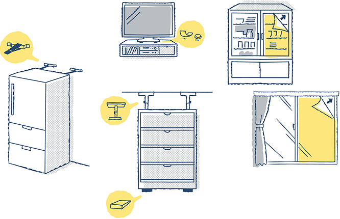 地震は24時(shí)間365日いつ起こるか分かりません。自宅で就寢中に発生する可能性もあります。強(qiáng)い縦揺れで大きな被害を生んだ阪神?淡路大震災(zāi)は、早朝という時(shí)間帯もあり、亡くなられた方のほとんどが、家具などの転倒や家屋の倒壊による圧死でした。地震が起きたら室內(nèi)にある家具や家電は転倒?落下するものだと考えて、L字金具や突っ張り棒で固定したり、粘著シートで動(dòng)きにくいようにしたり、対策しておくことが大切です。