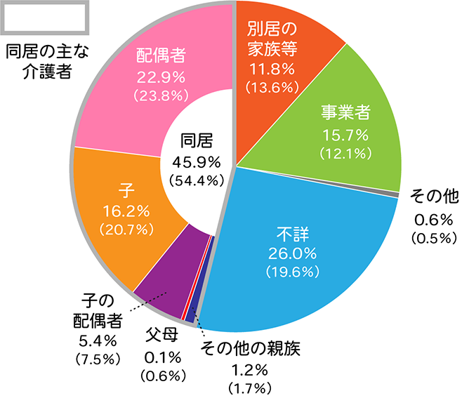 要介護者と家族が同居している割合が45.9%。そのうち、配偶者が介護する割合は22.9%、子が親を介護する割合は16.2%となっています。