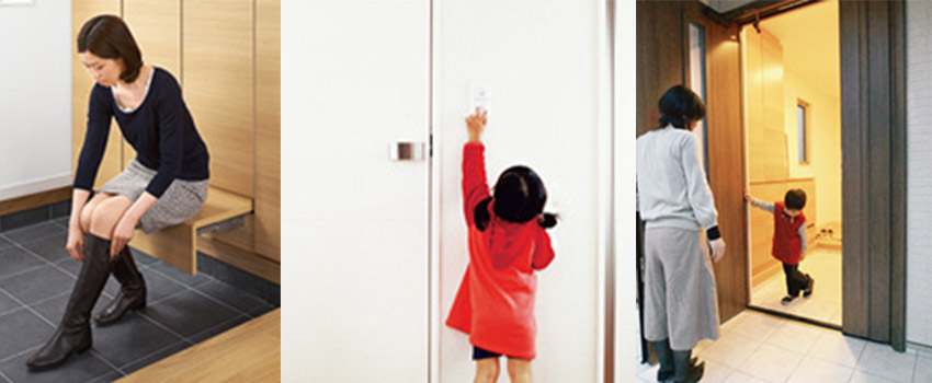 - 右/指はさみ防止機能付き玄関ドア:隙間を極力なくし、指はさみ事故を防止