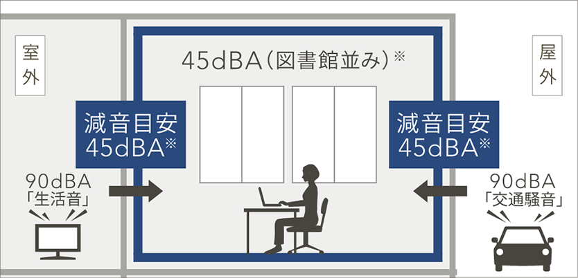 ※數値は、大和ハウス工業で測定した數値(JISA1417:2000 建築物の空気音遮斷性能の測定方法に基づく)ですが、性能値として保証するものではなく、使用狀況や周辺の環境、間取りなどにより異なる場合があります。
