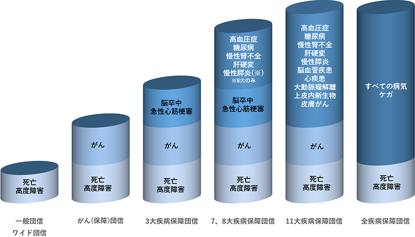 さらに近年、手厚い保障を付けた商品が増えています。3大疾病のほか、7、8、11、全疾病があります。わかりやすく団信の種類を大別したものは以下の通りです。