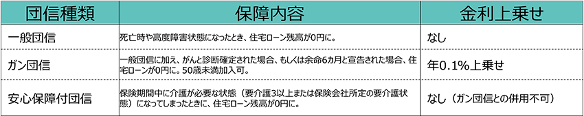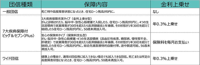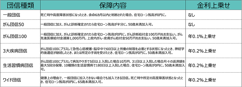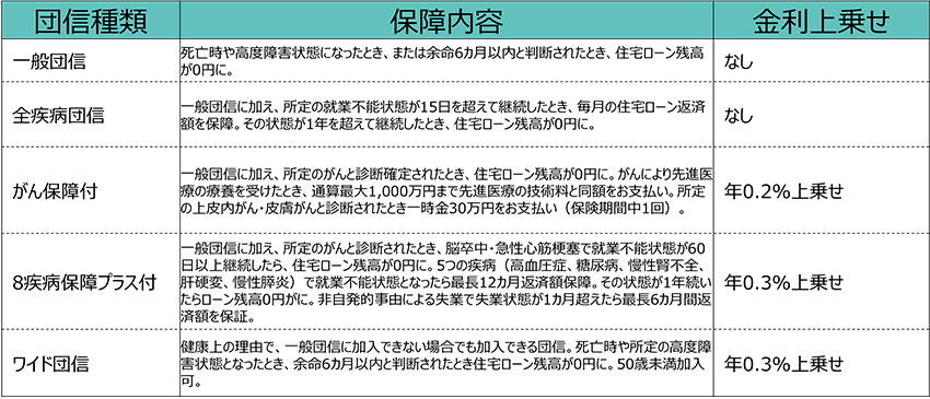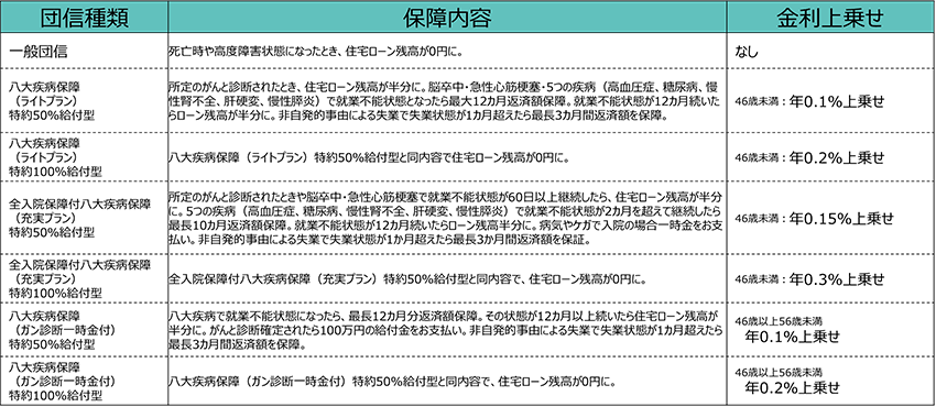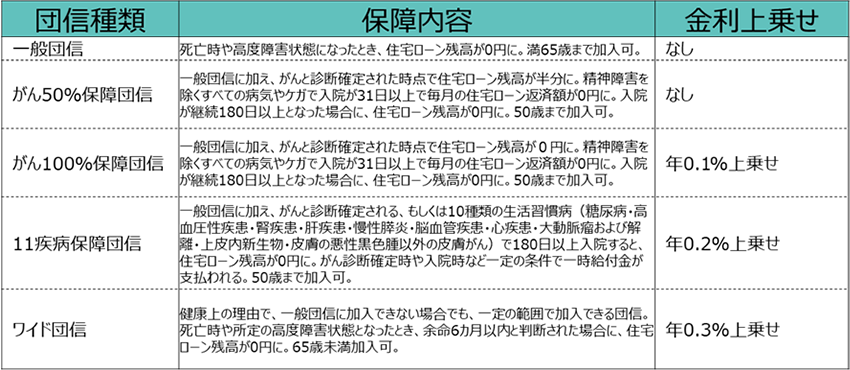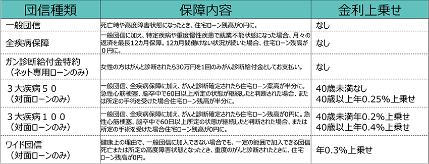そうはいっても個別に調べるのは大変ですので、比較検討がしやすいように主な金融機関で取り扱っている団信の種類を以下にまとめました。下記以外の金融機関や地方銀行などで獨自の商品を扱っている場合もありますので、最新の情報は必ずご自身で調べることをおすすめします。(下記は2023年2月現在の情報です)