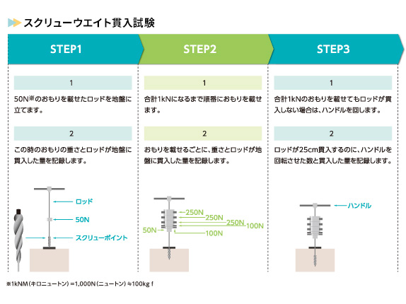 將來にわたって安全?安心な住まいを実現するために、地盤調査はとても重要です。建築基準法施行令でも地盤調査を行い、その結果に基づいて建物の基礎を選定することが定められています。地盤調査にはいくつかの種類があり、建物の規模や狀況に応じて最適な方法を選択しますが、戸建住宅で採用されているのが「スクリューウエイト貫入試験」です。これは、ねじ狀のスクリューポイントをつけたロッド(鉄の棒)を地盤に貫入させる方法で、まず、どのくらいのおもりを載せたら貫入するかを測定し、おもりが1kN(100kg)に達しても貫入しない場合は、こんどはどのくらい回転させたら貫入するかを25cm毎に測定します。