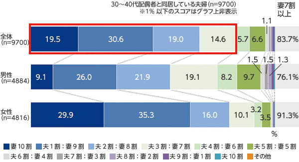 家事分擔率は妻7割:夫3割以上の家庭が80%を超え、妻側の認識では妻9割:夫1割とさらに妻の負擔率が高い。夫の認識でも妻の家事分擔率が高いと認識しているが、妻7割以上と思っているのは、夫76%に対して妻91%と、15%以上開きがあり、夫婦間の認識にズレが生じています。
