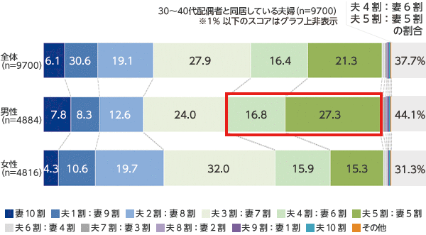 家事分擔率の理想を夫に聞くと、妻6割:夫4割、妻5割:夫5割が44%以上と半數に近く、妻の理想の家事分擔率よりも多いことがわかりました。家事シェアをできていない夫側も、もっと家事シェア比率を高めたい気持ちはあるが、行動に移せていないという狀況が浮き彫りになりました。