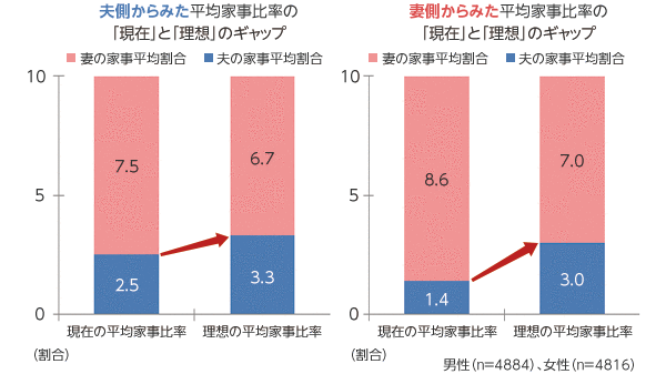 夫側からみた現在の家事シェア比率の平均は「夫2.5割:妻7.5割」でした。理想の比率を聞いてみると、「夫3.3割:妻6.7割」と約1割のシェア比率で「理想」に近づくことがわかりました。妻側からみた現狀の家事シェア比率と理想のギャップは約1.6割と夫側よりやや高いものの、家事シェア比率を「夫5割:妻5割」にしなければいけないわけではなく、お互いあと1割程度、歩み寄りたいという気持ちであることが分かりました。