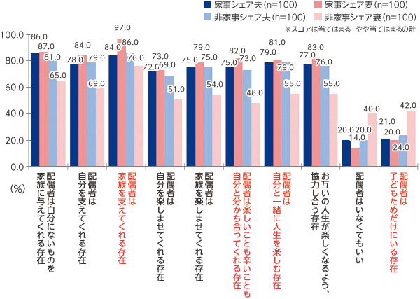 配偶者について聞いたところ、家事シェア妻の80%以上が夫のことを「何でも分かち合う存在」「人生を一緒に楽しむ存在」と認識。生活のベースである家事をシェアする夫婦ほど、配偶者のことを「家族を支えてくれる存在」と思う傾向が見られました。一方、家事がどちらかに片寄ってしまうと、妻から見て「子どものためだけにいる存在」や「配偶者はいなくてもいい」というスコアが高い結果となりました。